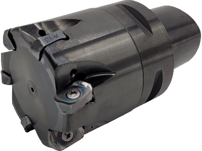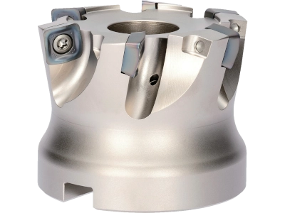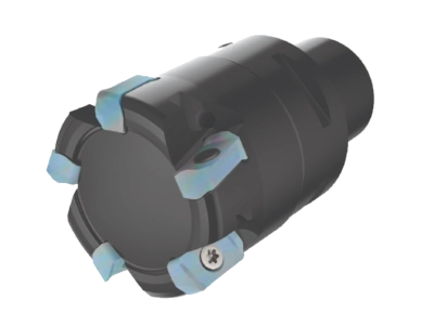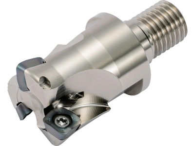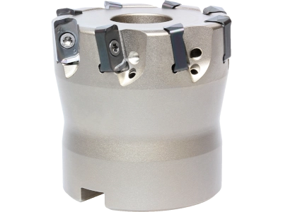 90° modular-type milling cutter with 4-edge convex inserts (with wiper option) for high feed milling, face milling, shoulder face milling, face milling with deep cutting (up to 5 mm), slot milling, ramping, helical milling, and plunge cutting.