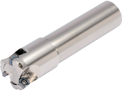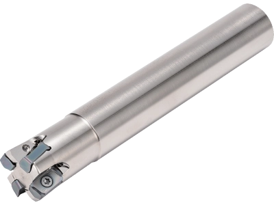 90° shank-type milling cutter with convex and high precision G-class inserts for high feed milling of small parts in small machining centres, a replacement for solid endmills.